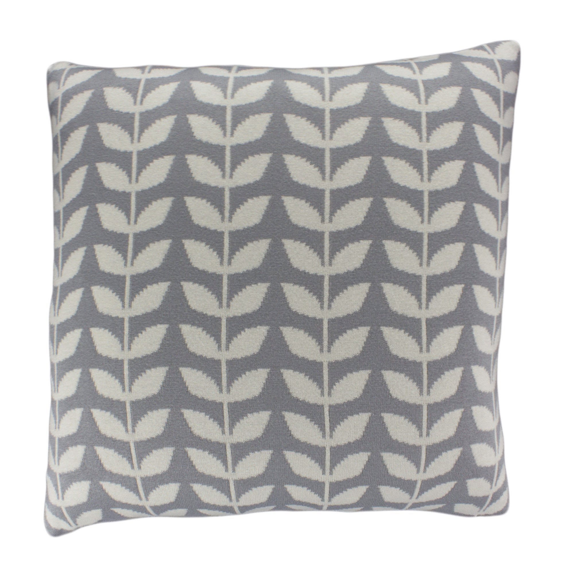 This tightly woven grey and ivory cotton knit pillow with its iconic retro repeating leaf pattern is very soft and comfortable to lie on. This pillow is constructed to withstand moderate tension and abrasion – therefore works in rooms that require durability.