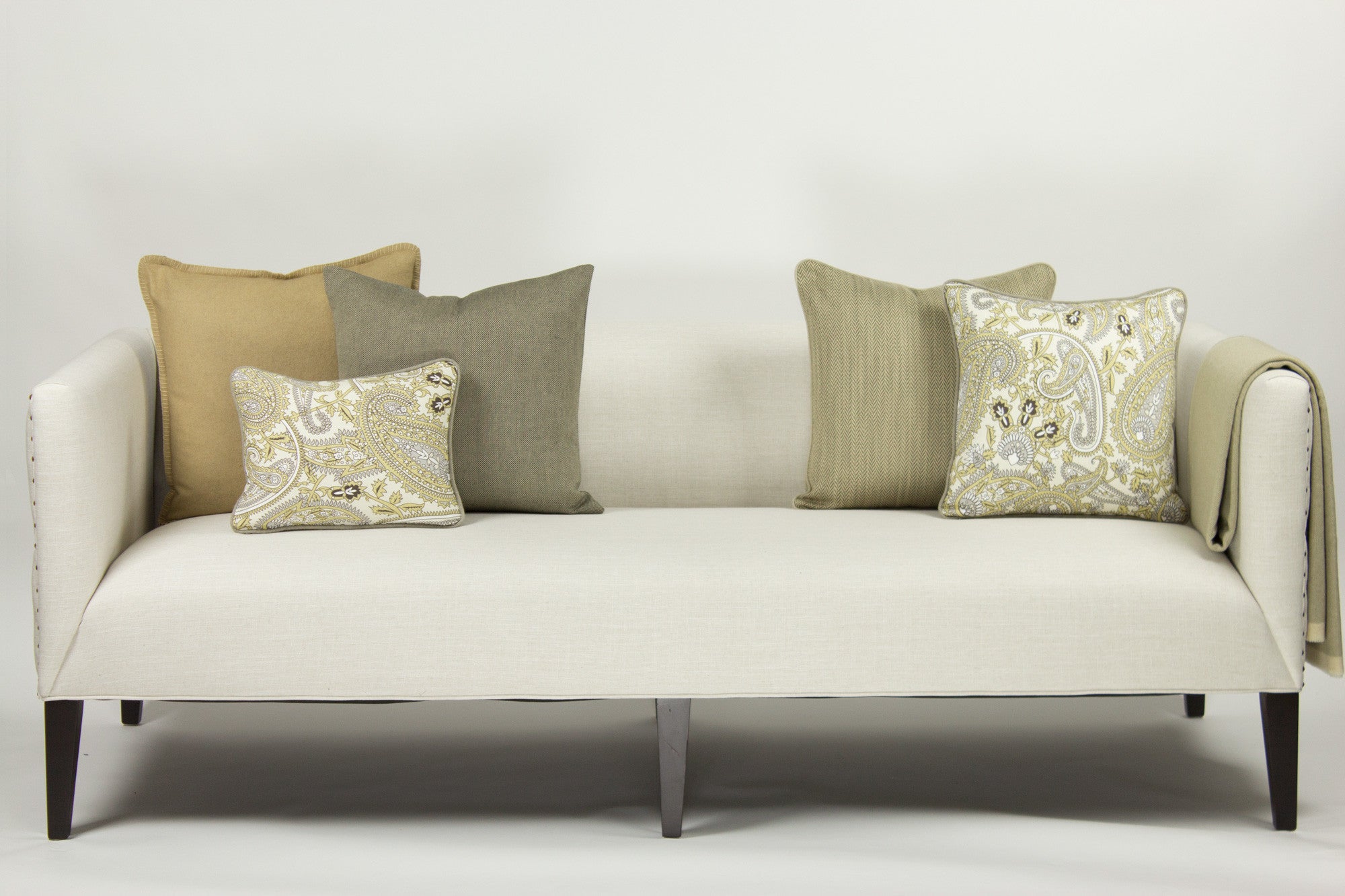 This large-scale classic paisley design with henna like appeal is printed on a medium weight cotton with an ivory background. The pattern is created using shades of dove grey, chocolate brown and a gold-under toned taupe. The pillow, backed and piped in heavy weight linen is constructed to withstand moderate tension and abrasion – therefore works in rooms that require durability. Given the mix of colours, this pillow is perfectly suited to work wonderfully in both warm and cool neutral settings.Feather Insert